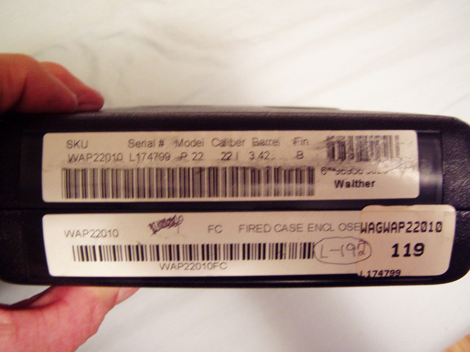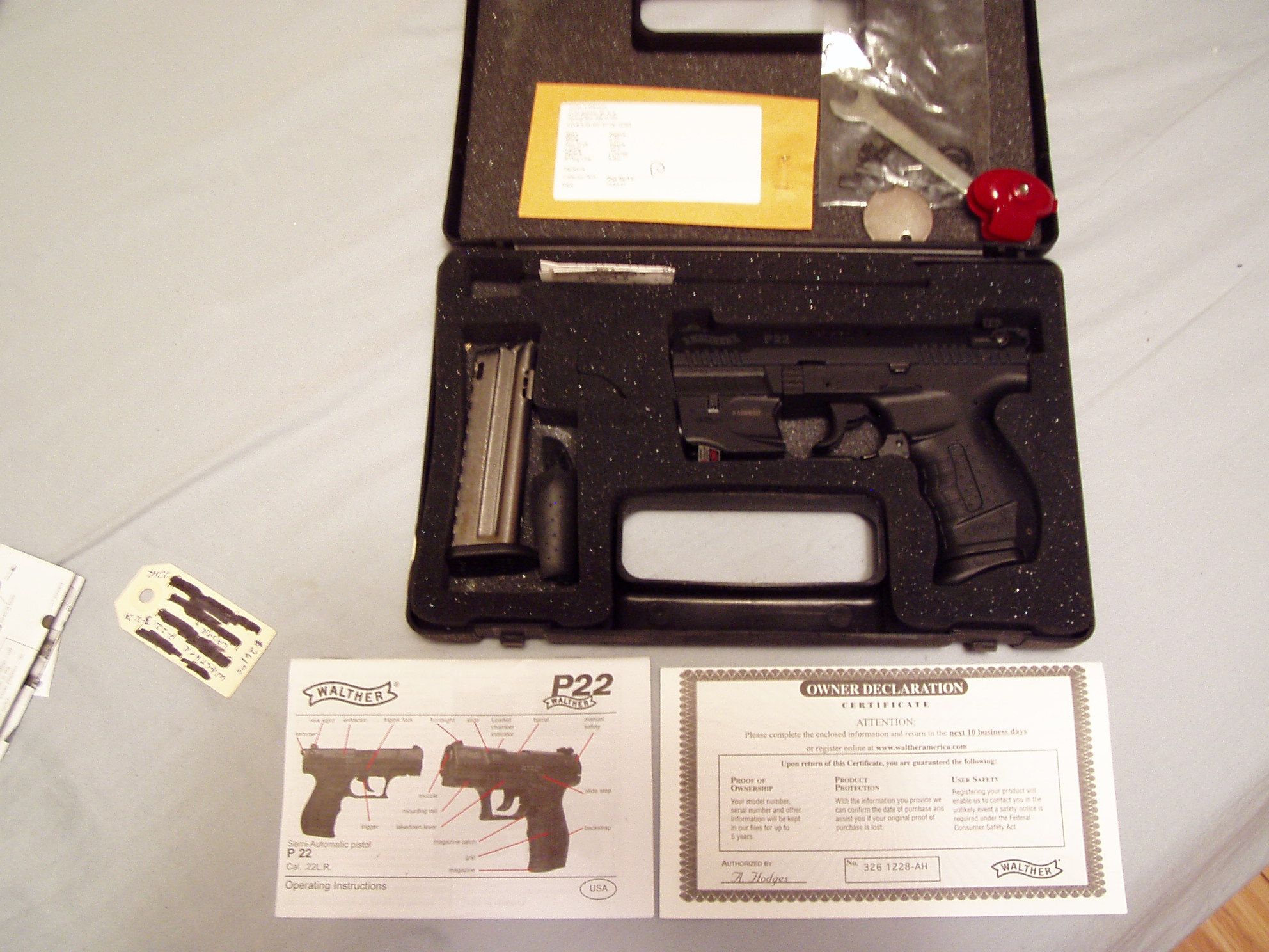 WALTHER P22 WALTHER P22 ,FACTORY RED DOT LASER SIGHT , HAS BARREL THREAD SUPPERSOR ADOPTER INCLUDED HAS UN FILLED OUT WARRANTY CARD WALTHER P22, FACTORY RED DOT LASER SIGHT, HAS BARREL THREAD SUPPERSOR ADOPTER INCLUED HAS UN FILLED OUT WARRANTY CARD Walther P-22 with laser. This is made by Walther and sold by Smith and Wesson. It has a 3 ½” long barrel chambered in .22 long rifle, the bore is excellent. There are two magazines BARREL HAS THREADED SUPPERSOR ADOPTER INCLUDED GUN APPEARS TO BE TEST FIRED ONLY HAS UN FILLED OUT WARRANTY CARD $ 395.00 Ask Question Paymentinfo: Payment by US Post Office Money Order Only Previous Article S&W 22A-1 semi auto. This is chambered in .22 LR and has an excellent bore. The barrel is 5 ½” long. The gun has been fired, like maybe one mag full. This was test fired on 12/09/10. This comes with t Next Article RAMLINE SYN-TECH EXACTOR 22LR PISTOL WITH THREE FACTORY MAGAZINES NEW IN HARD CASE Print