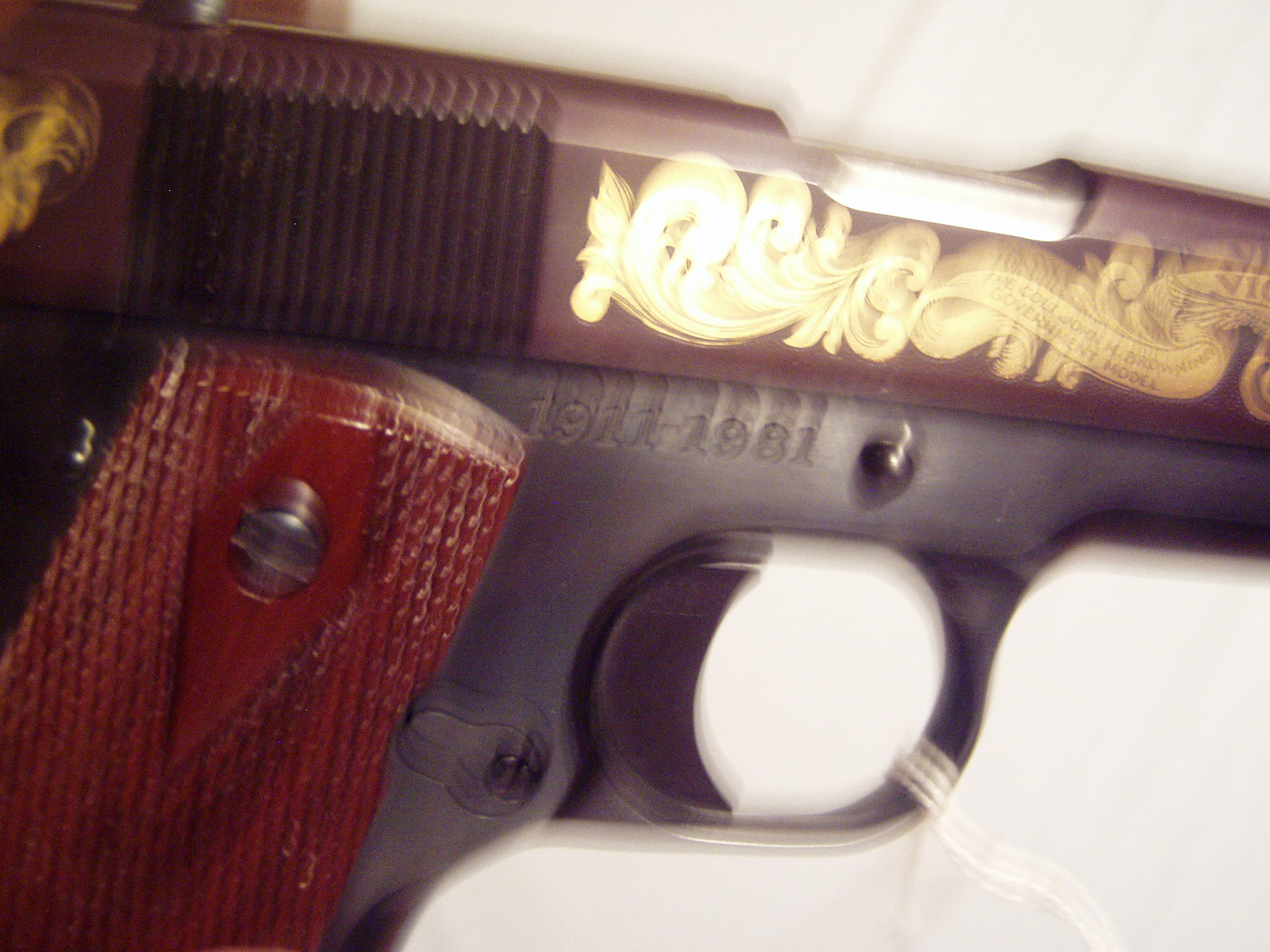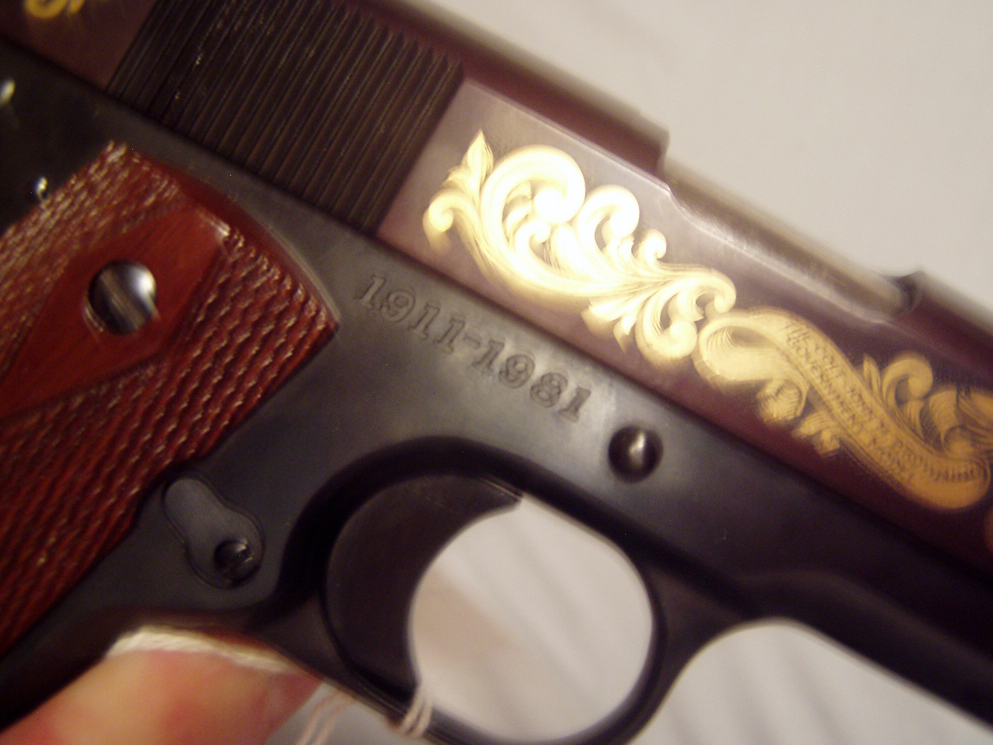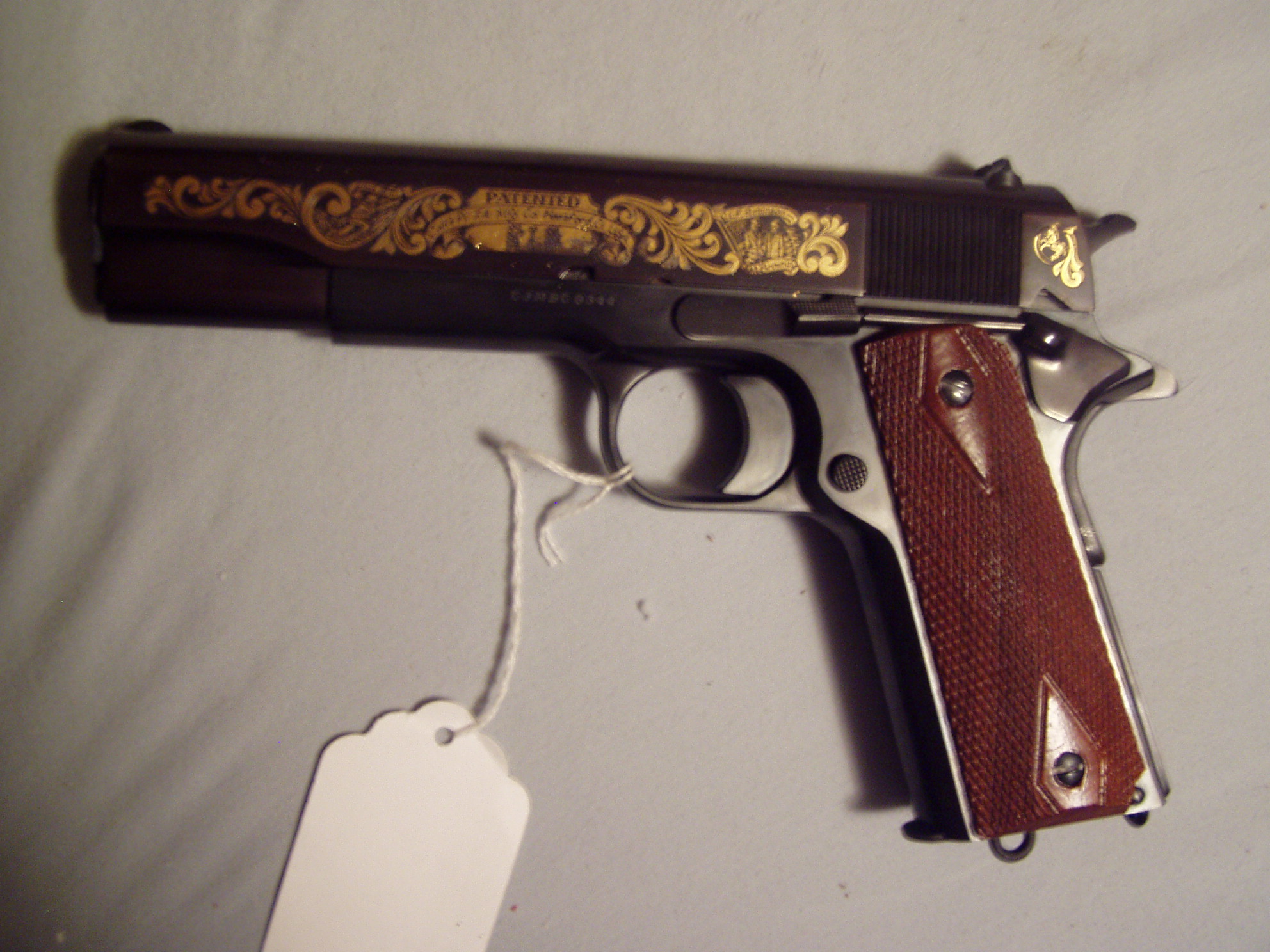 000 GOVERNENTS MODELS COLT JOHN M BROWNING COMMEMORATIVE 1911-1981 70 YEARS 45 ACP WOOD CASE $ 1399.99 COLT JOHN M BROWNING COMMEMORATIVE 1911-1981 70 YEARS 45 ACP WOOD CASE $ 1399.99 COLT JOHN M BROWNING COMMEMORATIVE 1911-1981 HONORS 70 YEARS OF COLT FIREARMS PRODUCTION OF OVER 3,000,000 GOVERNENTS MODELS Made in 1981 to commemorate America’s greatest firearms inventor, this is a Colt Government Model 1911, one of Browning’s most iconic designs, which has been decorated in gold and has scenes commemorating Browning and the influence he has had on America. It was produced after 90 years of production and more than 3,000,000 Government Models produced with the 1911 serving as the standard issue sidearm of US Armed Forces through two World Wars and other conflicts. The pistol is a throwback to the original, with flat mainspring housing and no trigger relief cuts on the frame as well as a lanyard-loop magazine. It comes with a nice case that’s ready for display. For fans of Browning, Colt or the 1911, this is a pistol well worth adding to your collection. $ 1399.99 Ask Question Paymentinfo: Payment by US Post Office Money Order Only Previous Article KIMBER SOLO CDP CUSTOM SHOP,ONLY 17OZ.$ 649.99 Next Article used Federal Ordnance M14A Rifle (7.62mm/.308 Win.). LOW SN 8904 Print