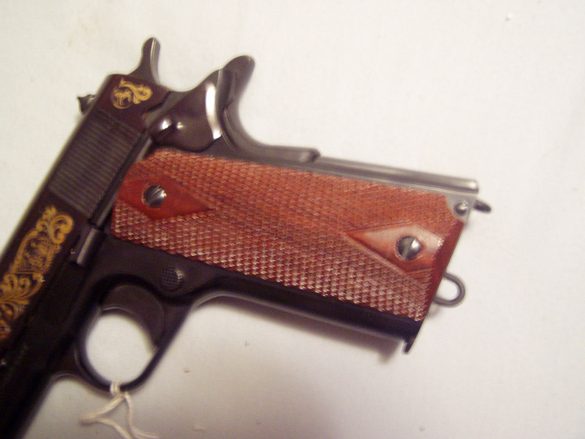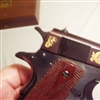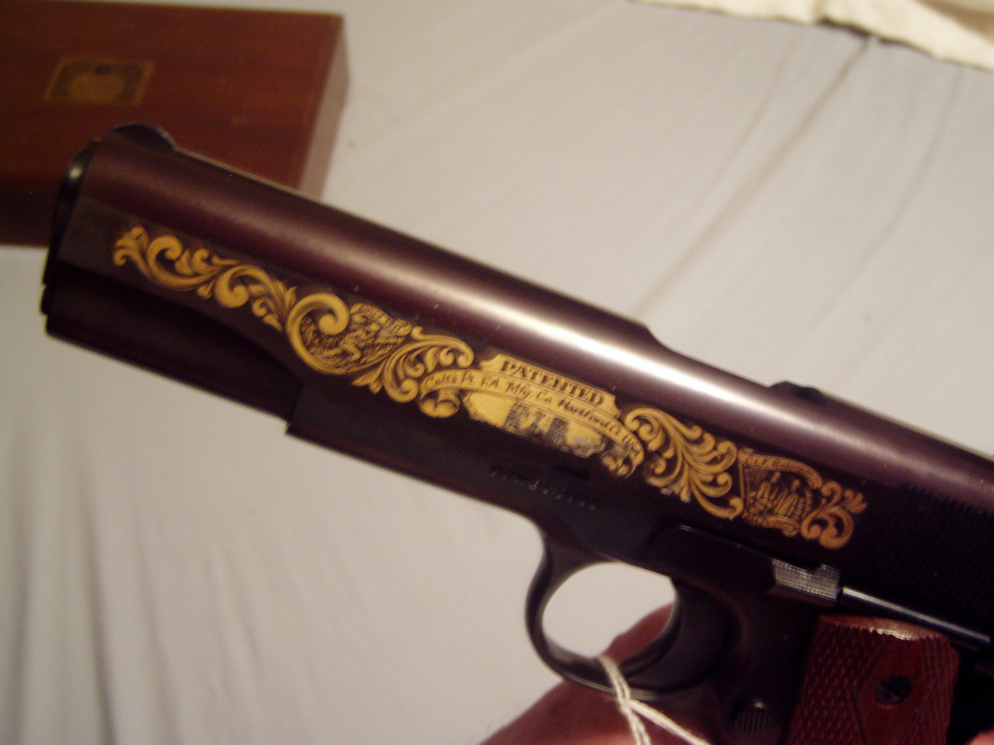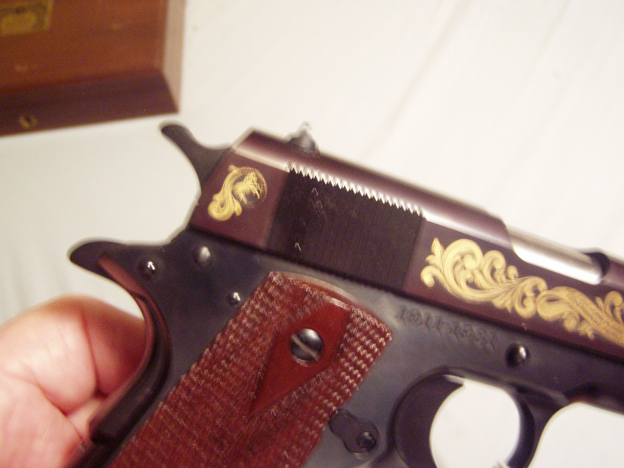 000 GOVERNENTS MODELS COLT JOHN M BROWNING COMMEMORATIVE 1911-1981 70 YEARS 45 ACP WOOD CASE $ 1399.99 COLT JOHN M BROWNING COMMEMORATIVE 1911-1981 70 YEARS 45 ACP WOOD CASE $ 1399.99 COLT JOHN M BROWNING COMMEMORATIVE 1911-1981 HONORS 70 YEARS OF COLT FIREARMS PRODUCTION OF OVER 3,000,000 GOVERNENTS MODELS Made in 1981 to commemorate America’s greatest firearms inventor, this is a Colt Government Model 1911, one of Browning’s most iconic designs, which has been decorated in gold and has scenes commemorating Browning and the influence he has had on America. It was produced after 90 years of production and more than 3,000,000 Government Models produced with the 1911 serving as the standard issue sidearm of US Armed Forces through two World Wars and other conflicts. The pistol is a throwback to the original, with flat mainspring housing and no trigger relief cuts on the frame as well as a lanyard-loop magazine. It comes with a nice case that’s ready for display. For fans of Browning, Colt or the 1911, this is a pistol well worth adding to your collection. $ 1399.99 Ask Question Paymentinfo: Payment by US Post Office Money Order Only Previous Article KIMBER SOLO CDP CUSTOM SHOP,ONLY 17OZ.$ 649.99 Next Article used Federal Ordnance M14A Rifle (7.62mm/.308 Win.). LOW SN 8904 Print
