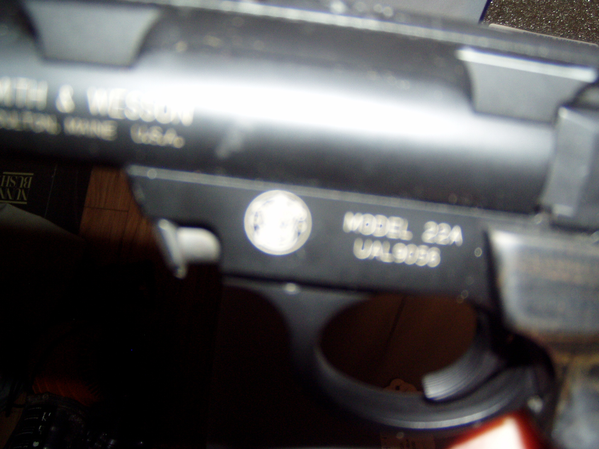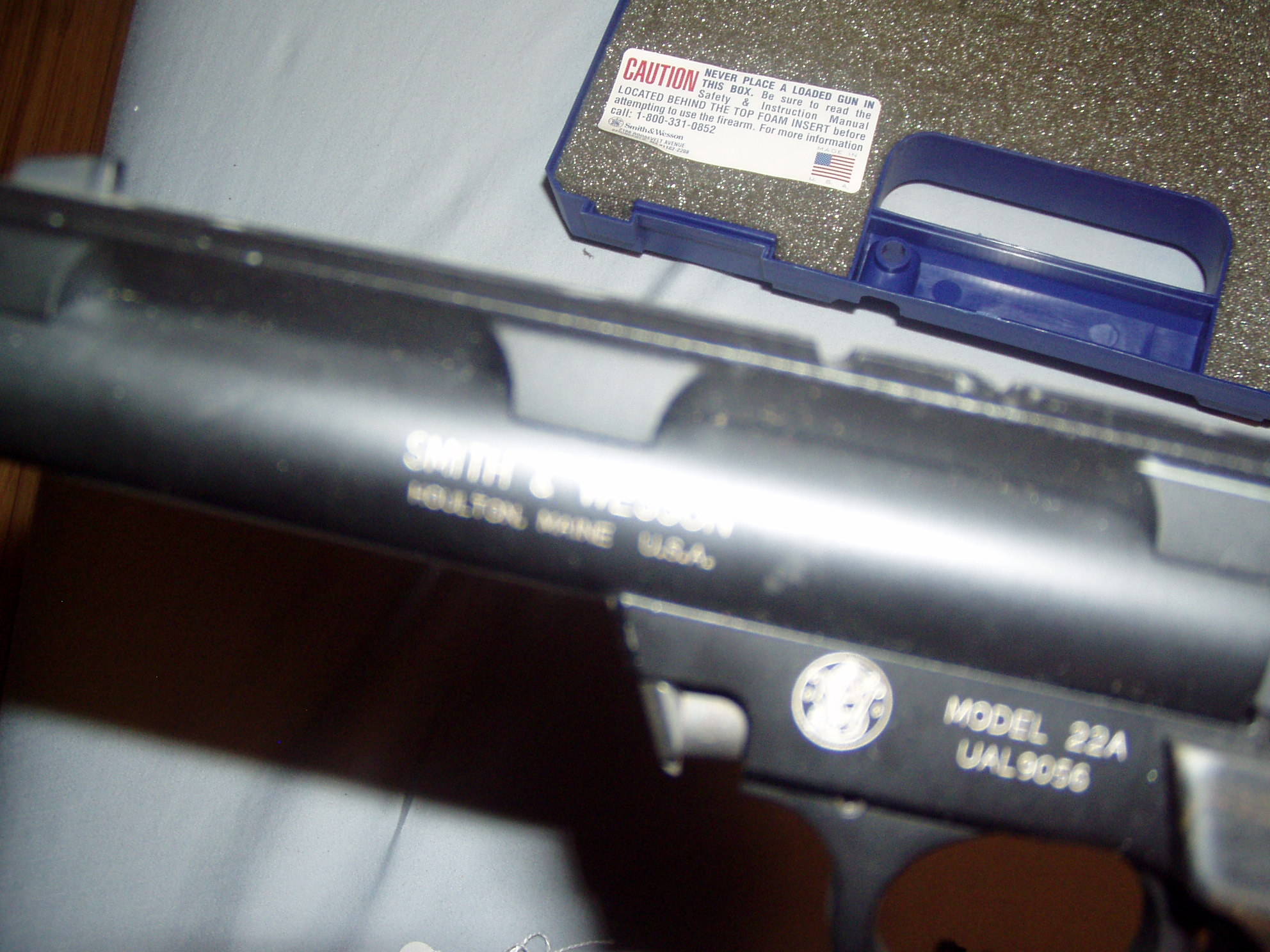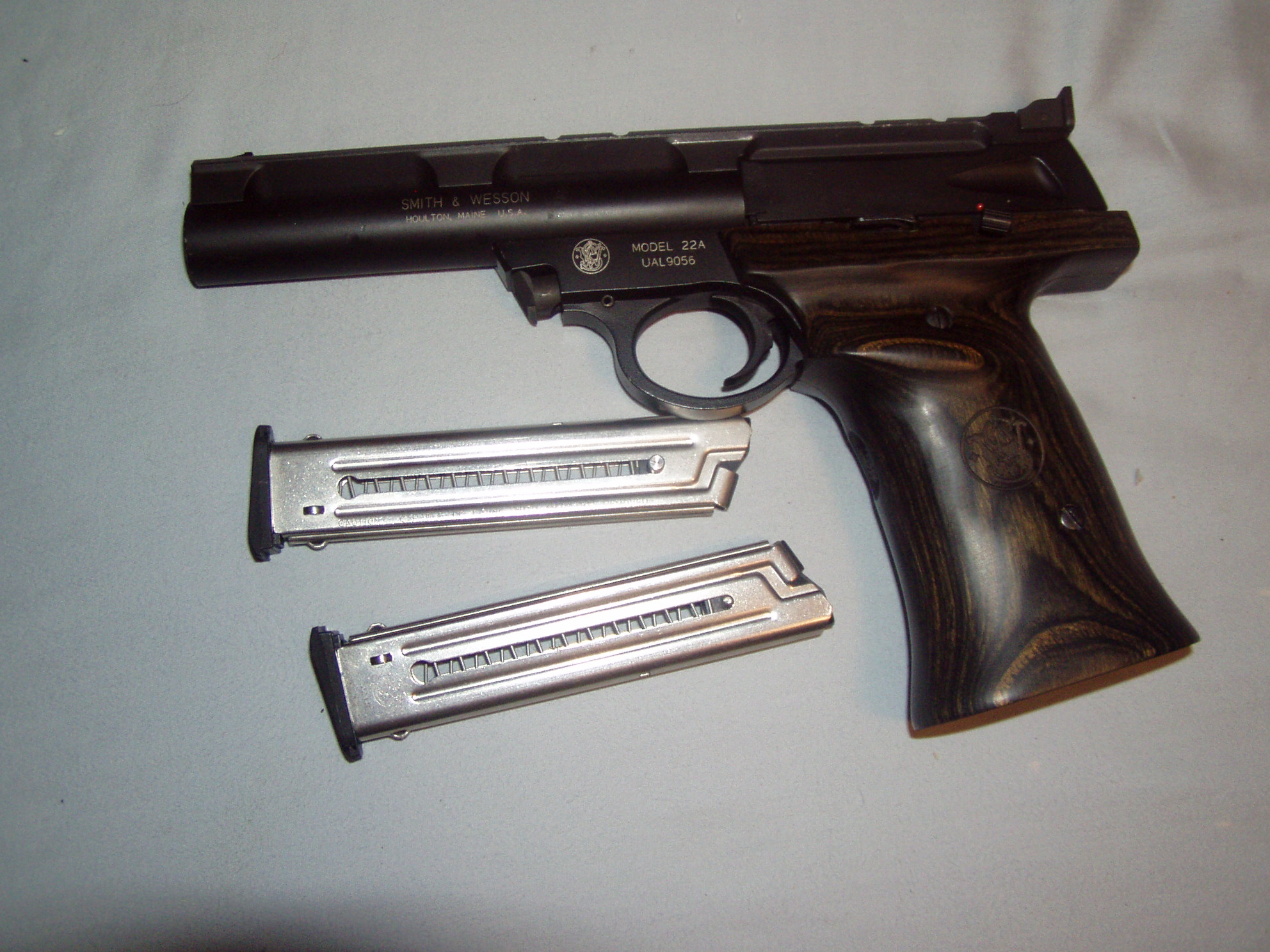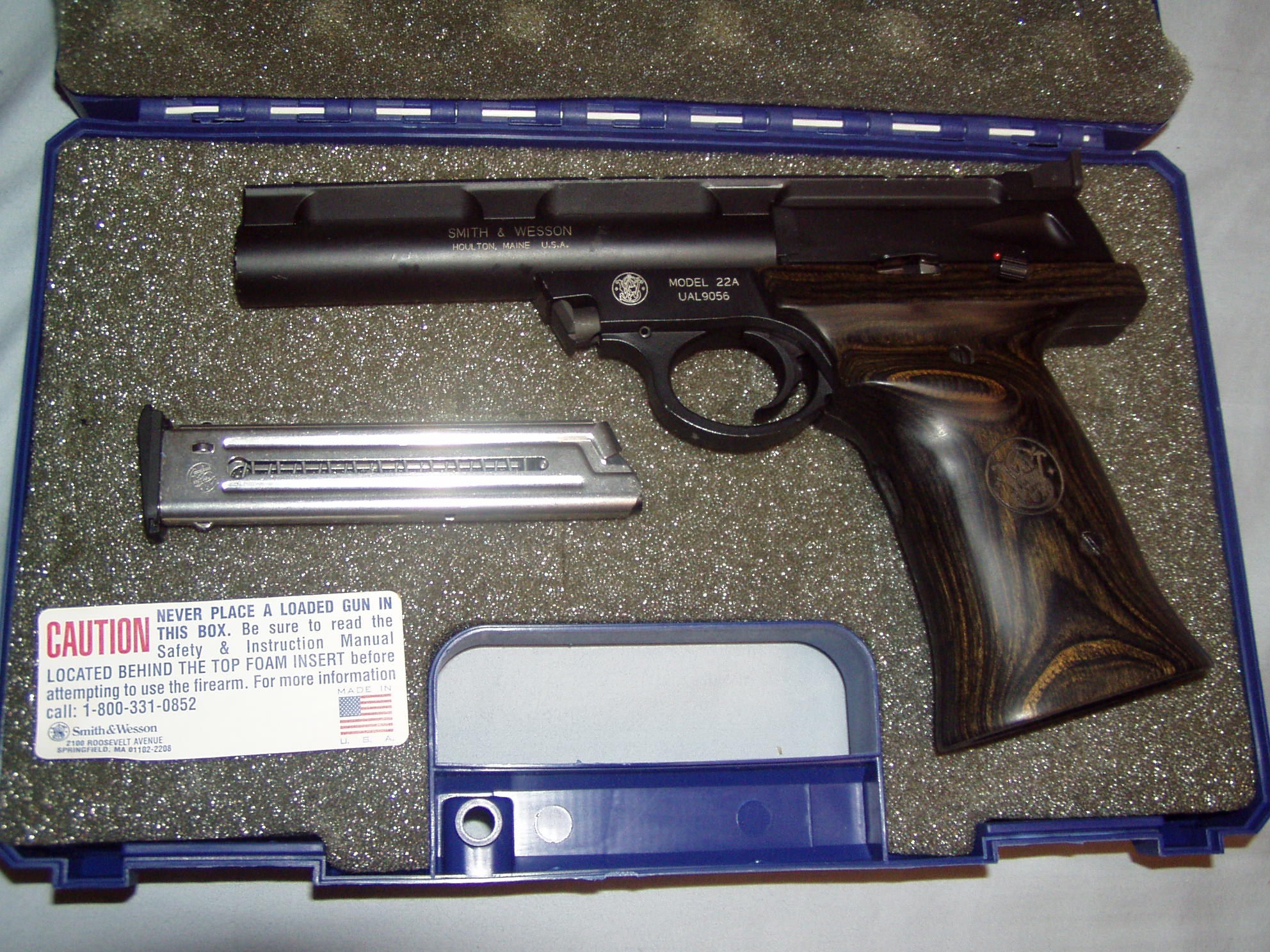S&W 22A TARGET PISTOL Smith & Wesson LIKE NEW Model 22A 5.5 INCH BULL BARREL TARGET SIGHT AND TARGET WOOD GRIPS $ 525.00 Smith & Wesson LIKE NEW Model 22A 5.5 INCH BULL BARREL TARGET SIGHT AND TARGET WOOD GRIPS $ 525.00 DISCONTINUED Smith & Wesson LIKE NEW Model 22A 5.5 INCH BULL BARREL TARGET SIGHT AND TARGET WOOD GRIPS is a semi-automatic pistol that was manufactured in Houlton, Maine. The 22A is a full-size pistol with an aluminum alloy frame. The steel barrel has an integrated Weaver style rail (similar to a Picatinny). IN NUMBERED HARD BLUE CASE WITH BOTH MAGS UNFILLED OUT WARRANTY CARD AND INSTRUCTION BOOL MADE 1997 This pistol is distinguished by two features: An integral rail along the top edge of the gun permits easy mounting of optical sights and other accessories. The gun's alloy frame and alloy-shrouded barrel help keep weight down for a full-sized pistol. $ 525.00 Ask Question Paymentinfo: Payment by US Post Office Money Order Only Previous Article used Federal Ordnance M14A Rifle (7.62mm/.308 Win.). LOW SN 8904 Next Article used Blue Colt Army Special in .41 Long Colt caliber with a 5 inch barrel SN 341194 . $ 529.00 Print