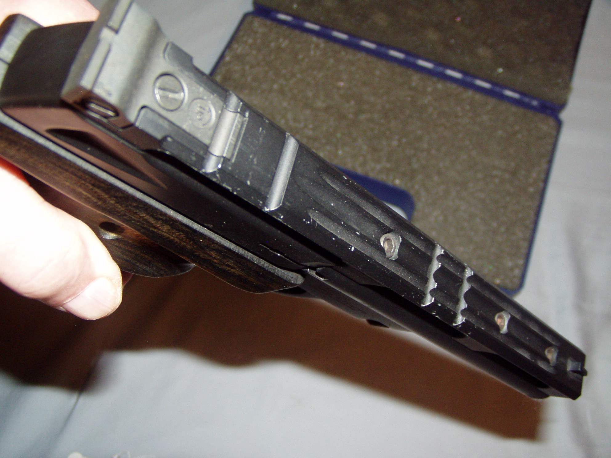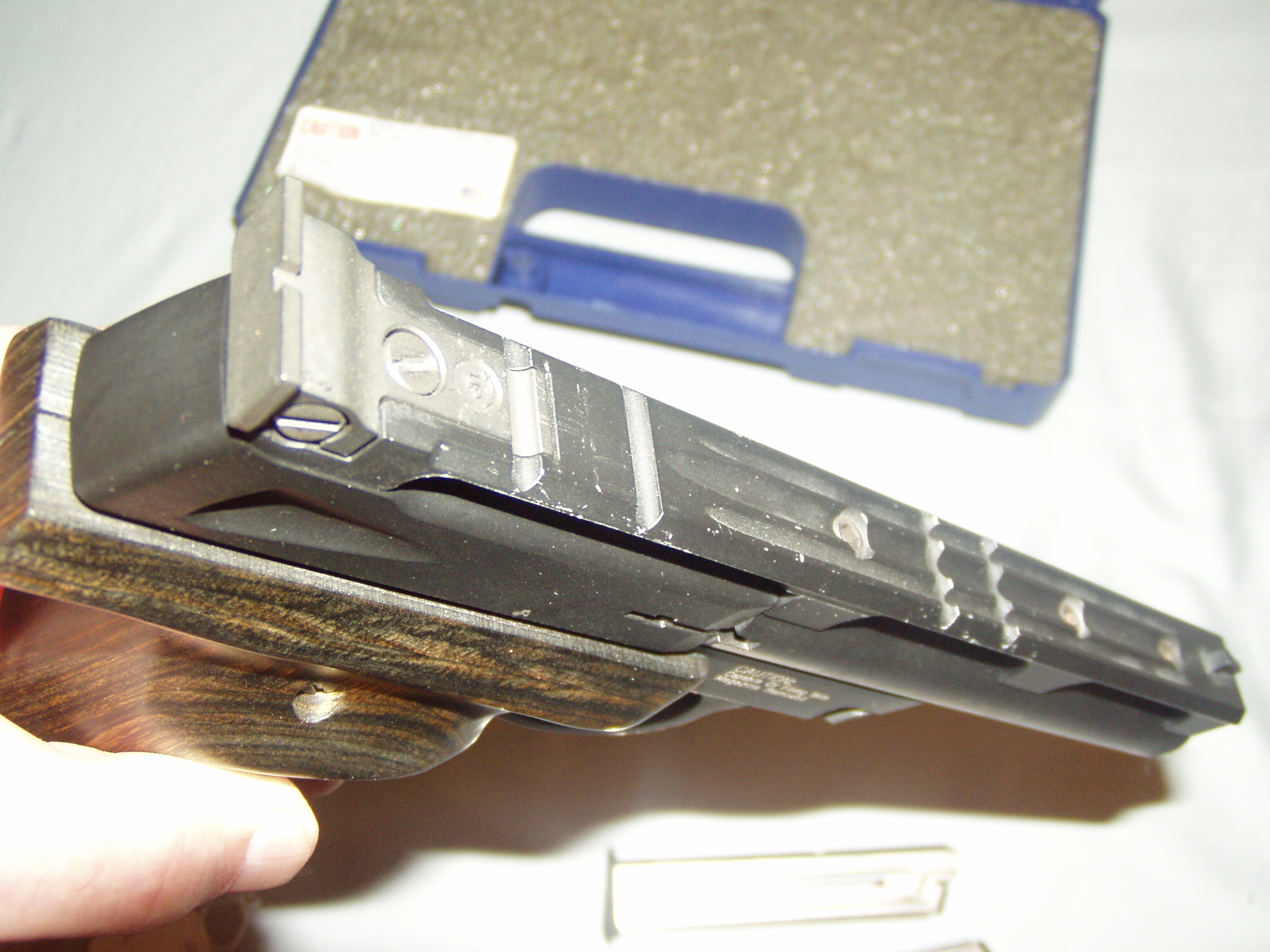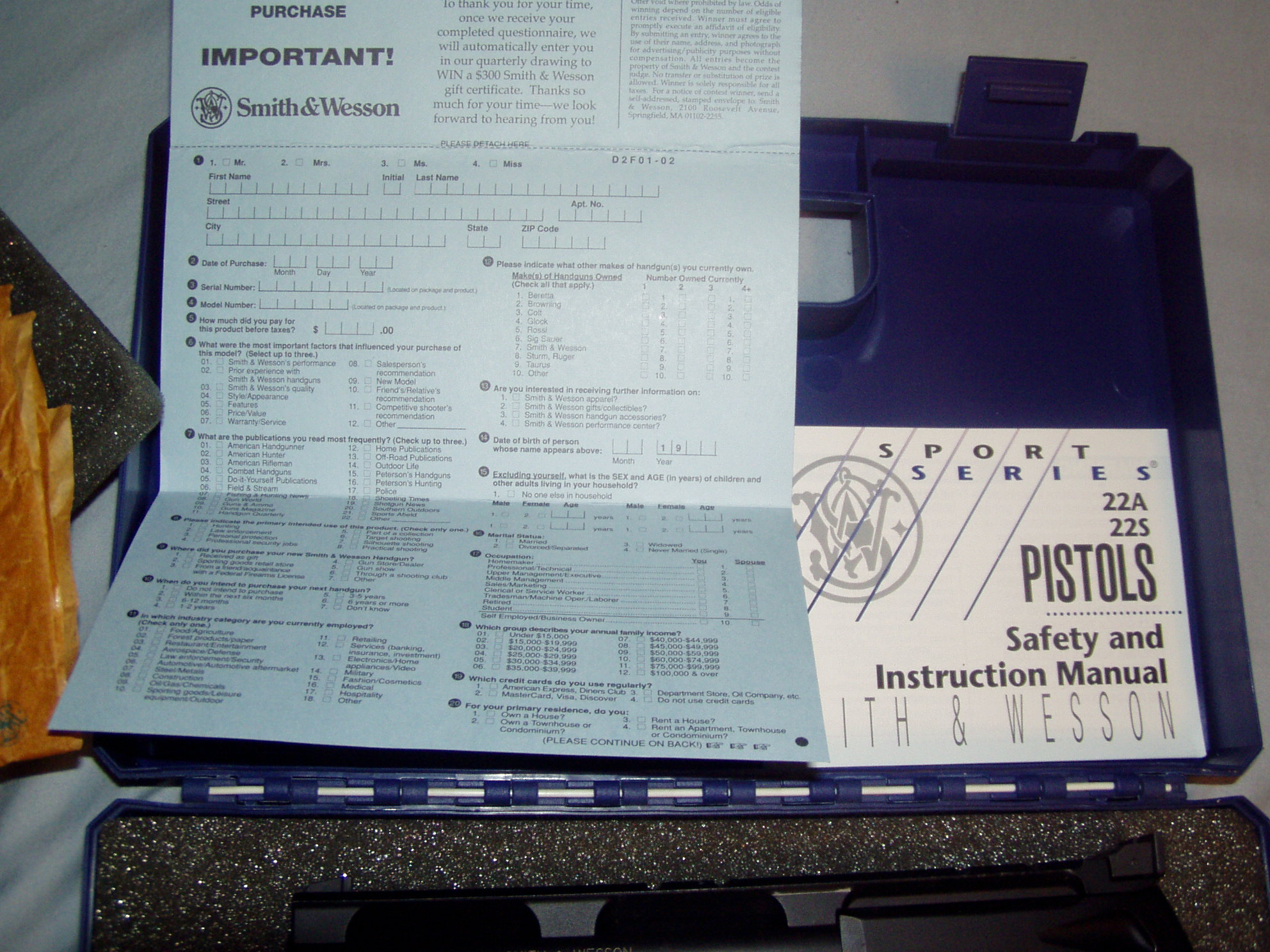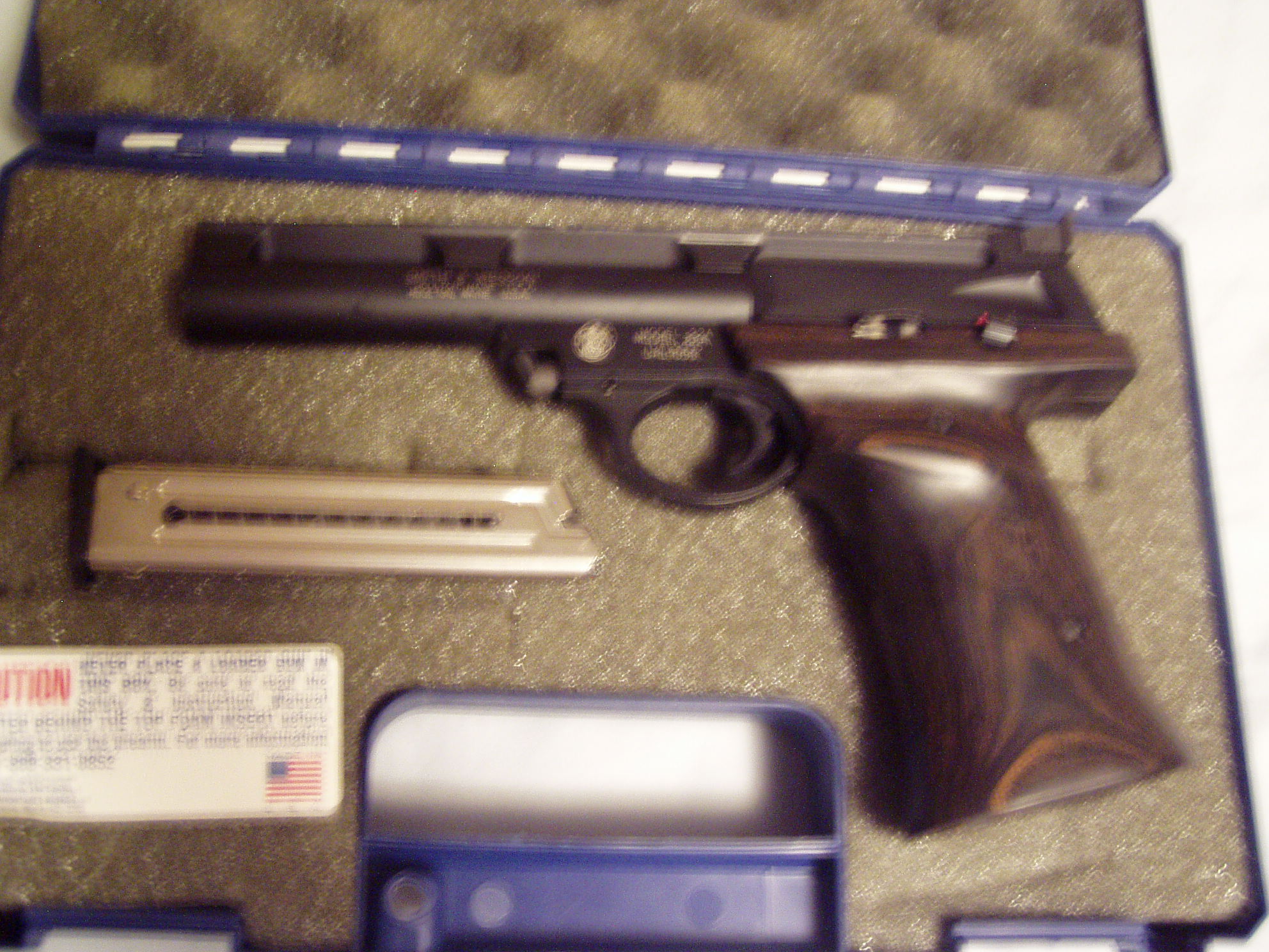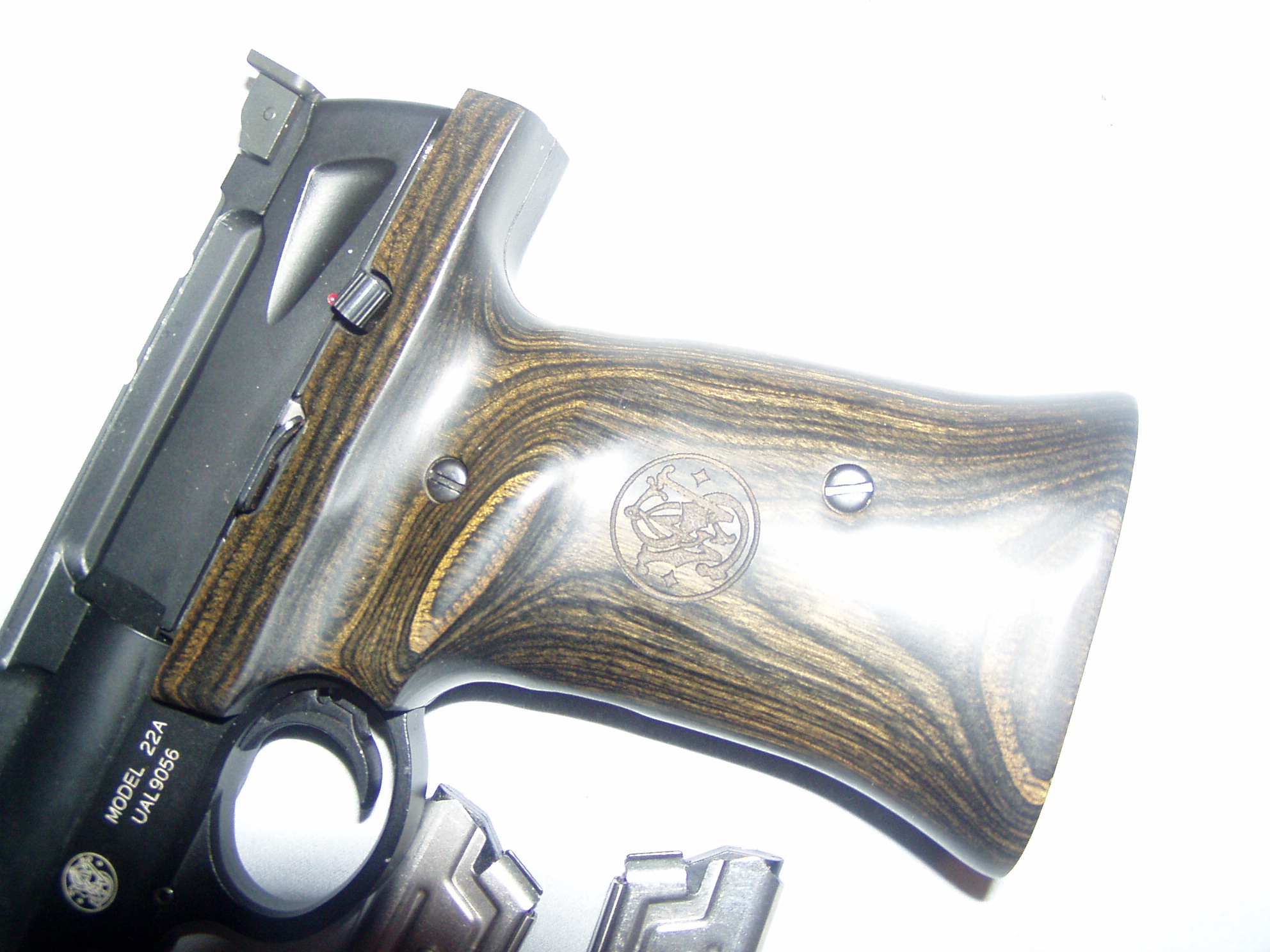 S&W 22A TARGET PISTOL Smith & Wesson LIKE NEW Model 22A 5.5 INCH BULL BARREL TARGET SIGHT AND TARGET WOOD GRIPS $ 525.00 Smith & Wesson LIKE NEW Model 22A 5.5 INCH BULL BARREL TARGET SIGHT AND TARGET WOOD GRIPS $ 525.00 DISCONTINUED Smith & Wesson LIKE NEW Model 22A 5.5 INCH BULL BARREL TARGET SIGHT AND TARGET WOOD GRIPS is a semi-automatic pistol that was manufactured in Houlton, Maine. The 22A is a full-size pistol with an aluminum alloy frame. The steel barrel has an integrated Weaver style rail (similar to a Picatinny). IN NUMBERED HARD BLUE CASE WITH BOTH MAGS UNFILLED OUT WARRANTY CARD AND INSTRUCTION BOOL MADE 1997 This pistol is distinguished by two features: An integral rail along the top edge of the gun permits easy mounting of optical sights and other accessories. The gun's alloy frame and alloy-shrouded barrel help keep weight down for a full-sized pistol. $ 525.00 Ask Question Paymentinfo: Payment by US Post Office Money Order Only Previous Article used Federal Ordnance M14A Rifle (7.62mm/.308 Win.). LOW SN 8904 Next Article used Blue Colt Army Special in .41 Long Colt caliber with a 5 inch barrel SN 341194 . $ 529.00 Print