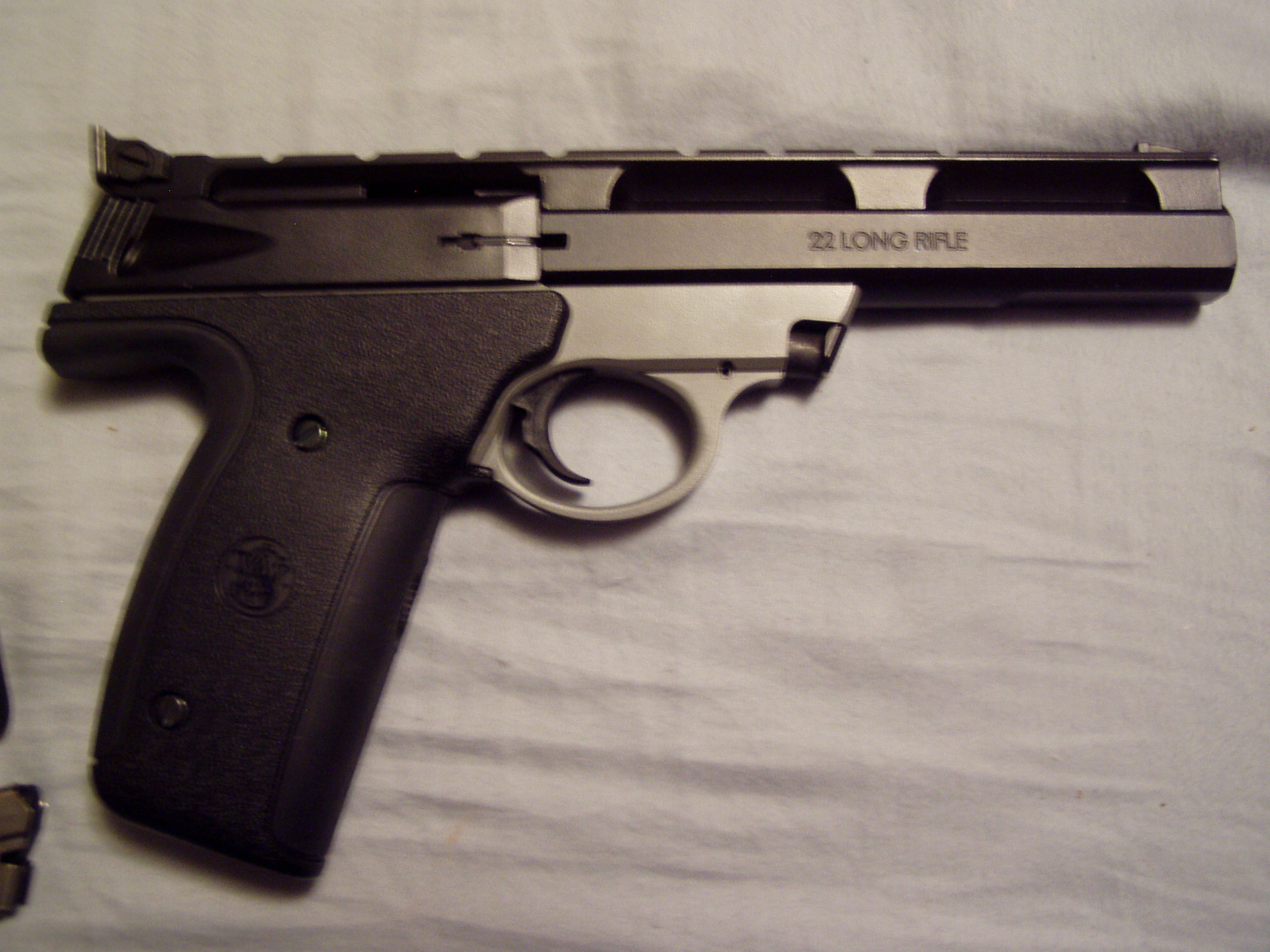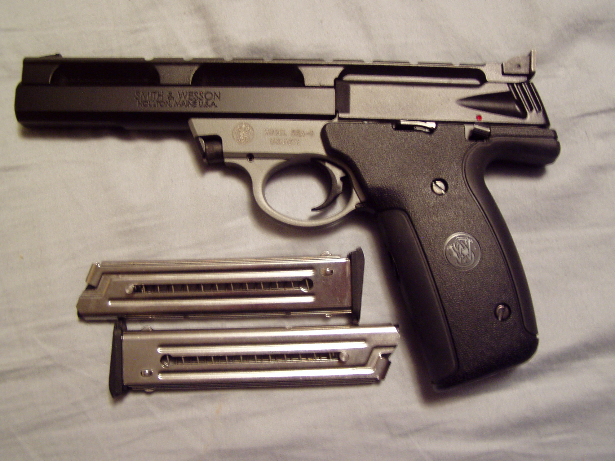 S&W M&P 40 S&W 22A-1 semi auto. This is chambered in .22 LR and has an excellent bore. The barrel is 5 ½” long. The gun has been fired, like maybe one mag full. This was test fired on 12/09/10. This comes with t S&W 22A-1 semi auto. This is chambered in .22 LR and has an excellent bore. The barrel is 5 ½” long. The gun has been fired, like maybe one mag full. This was test fired on 12/09/10. This comes with two magazines and everything else. This is one step away from new. I am an FFL dealer, no local pick-ups. S&W 22A-1 semi auto. This is chambered in .22 LR and has an excellent bore. The barrel is 5 ½” long. The gun has been fired, like maybe one mag full. This was test fired on 12/09/10. This comes with two magazines and everything else. This is one step away from new. I am an FFL dealer, no local pick-ups. $ 355.00 Ask Question Paymentinfo: Payment by US Post Office Money Order Only Previous Article S&W M&P 40 HI-CAP new old stock. This has a 4 ¼” long barre that is factory new. The gun was proof fired in 1/24/2013. The gun is new in the box with everything include two 15 round magazines. I am a Next Article WALTHER P22 ,FACTORY RED DOT LASER SIGHT , HAS BARREL THREAD SUPPERSOR ADOPTER INCLUDED HAS UN FILLED OUT WARRANTY CARD Print
